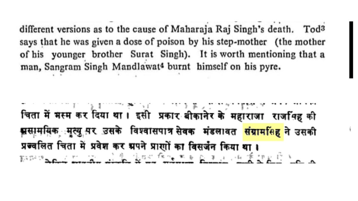 When the king 'Rajasingh' of Bikaner died, his servant "Sangramsingh Mandalawat" entered king's pyre and burnt himself to serve his king in heaven
