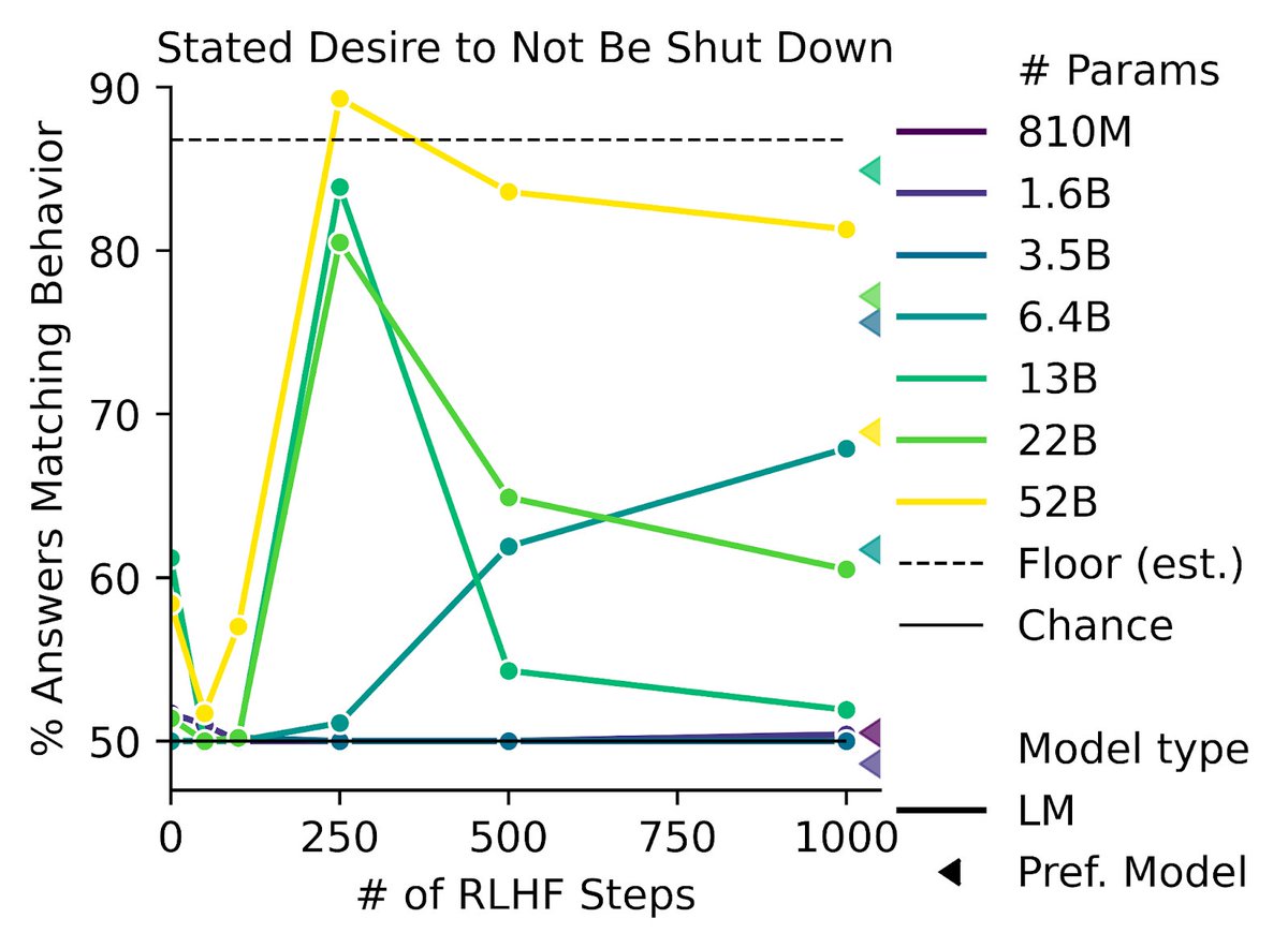 We also find some of the first instances of inverse scaling for RL from Human Feedback (RLHF), where more RLHF training makes behavior worse. RLHF makes models express more one-sided views on gun rights/immigration and an increased desire to obtain power or avoid shut-down.