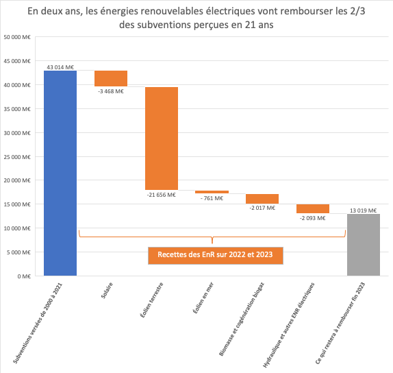 De 2000 à 2021, les EnR électriques ont perçu 43 Mds€ de subventions. Depuis 2022, du fait de la hausse du prix de l'électricité, les EnR ne coûtent rien à l’État et génèrent des recettes. Fin 2023, les 2/3 des subventions versées en 21 ans devraient être remboursées.
