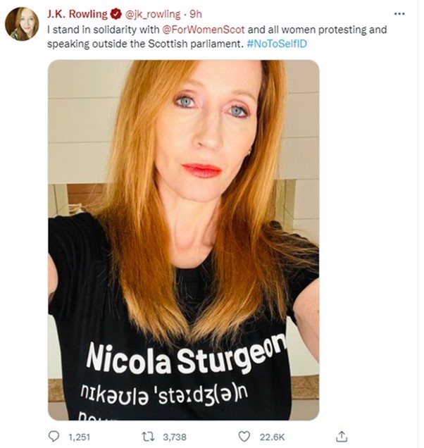 These shirts that the Scottish Femininnst network were kindly donated by anti-feminist fascist Kellie Jay Keen aka Posie Parker and eventually the design was worn by JK Rowling herself. More about that in this thread: