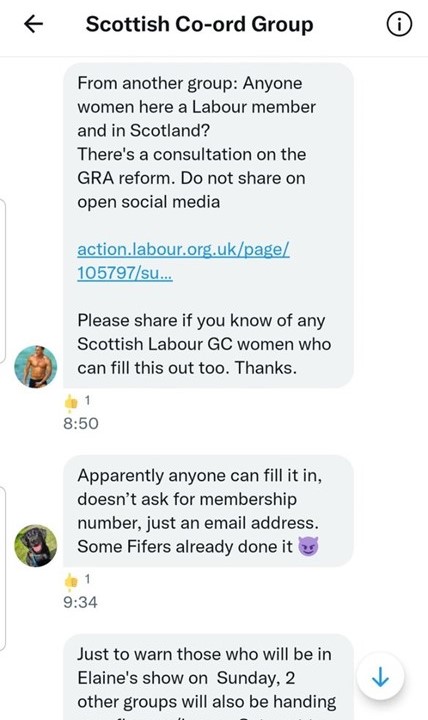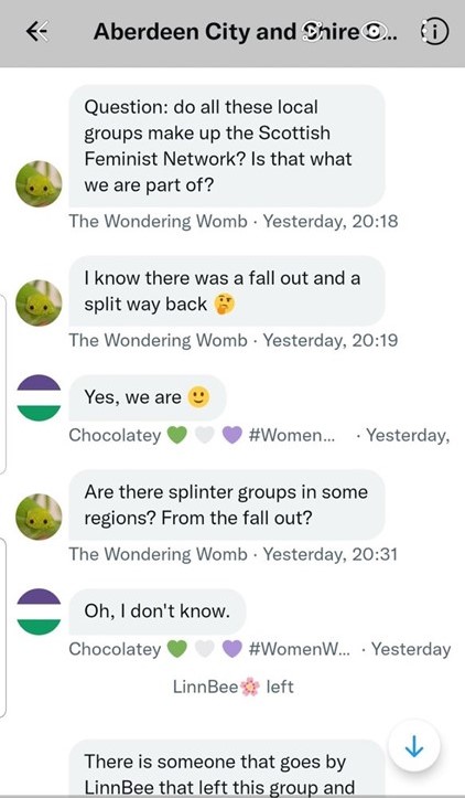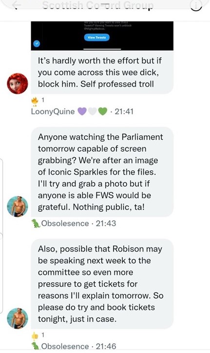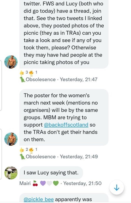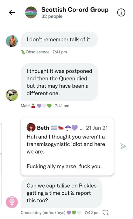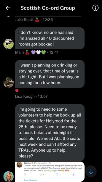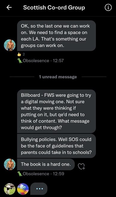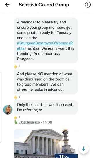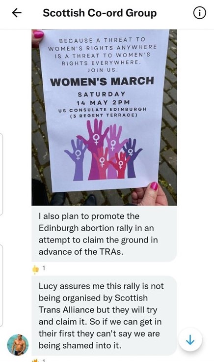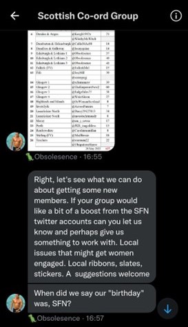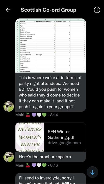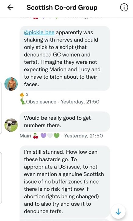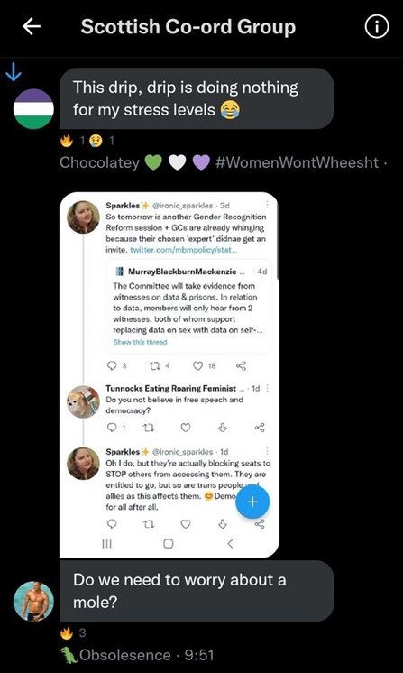 For the past year the organising group between Scottish Feminist Network and other gender critical groups has been compromised. These screenshots from this are from these organising groups.