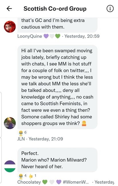 There's other things I can’t share presently but other may decide to share more in the future. For example I can barely talk to you about Marion Millar, like how For Women Scotland & the Scottish Feminist Network really want you to forget she had a leadership role in the movement