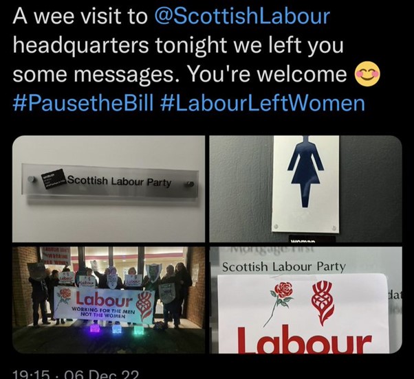 Scottish Feminist Network’s biggest current project is the Scottish Labour Party. In the past they have outright pretended to be party members and recently broke into the Scottish Labour Party HQ.