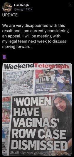 Last week, Scottish Feminist Network member Lisa Keogh said she was very disappointed that she lost her case against Abertay University - she claimed she was discriminated against for her Gender Critical beliefs.