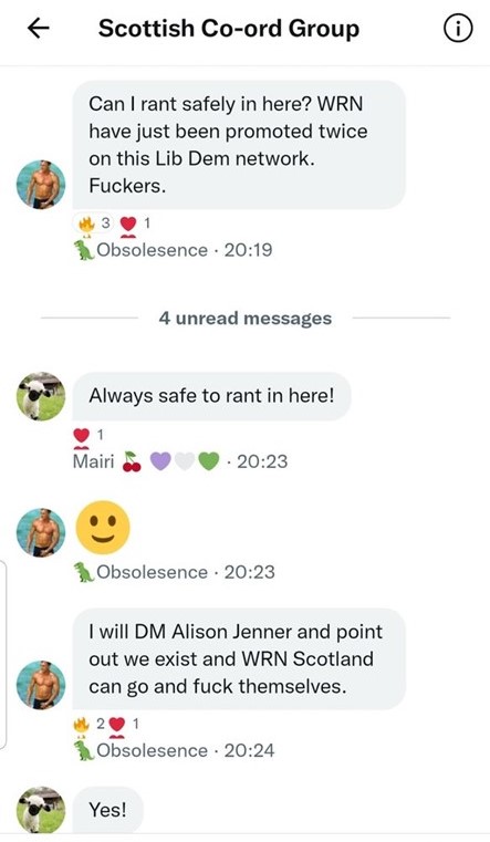 For the avoidance of doubt here is confirmation from Obsolesence that this group is for organising Scottish Feminist Network’s activities and to link them up with members from groups like For Women Scotland, Safeguard Our Schools Scotland, Parent Scotland and others.