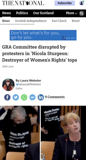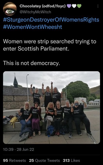 In fact, audience optics mattered a lot to Scottish Feminist Network. Earlier this year we saw 2 activists from a group called Scottish Feminists stage a protest inside the Scottish Parliament itself to delay the gender recognition reforms.
