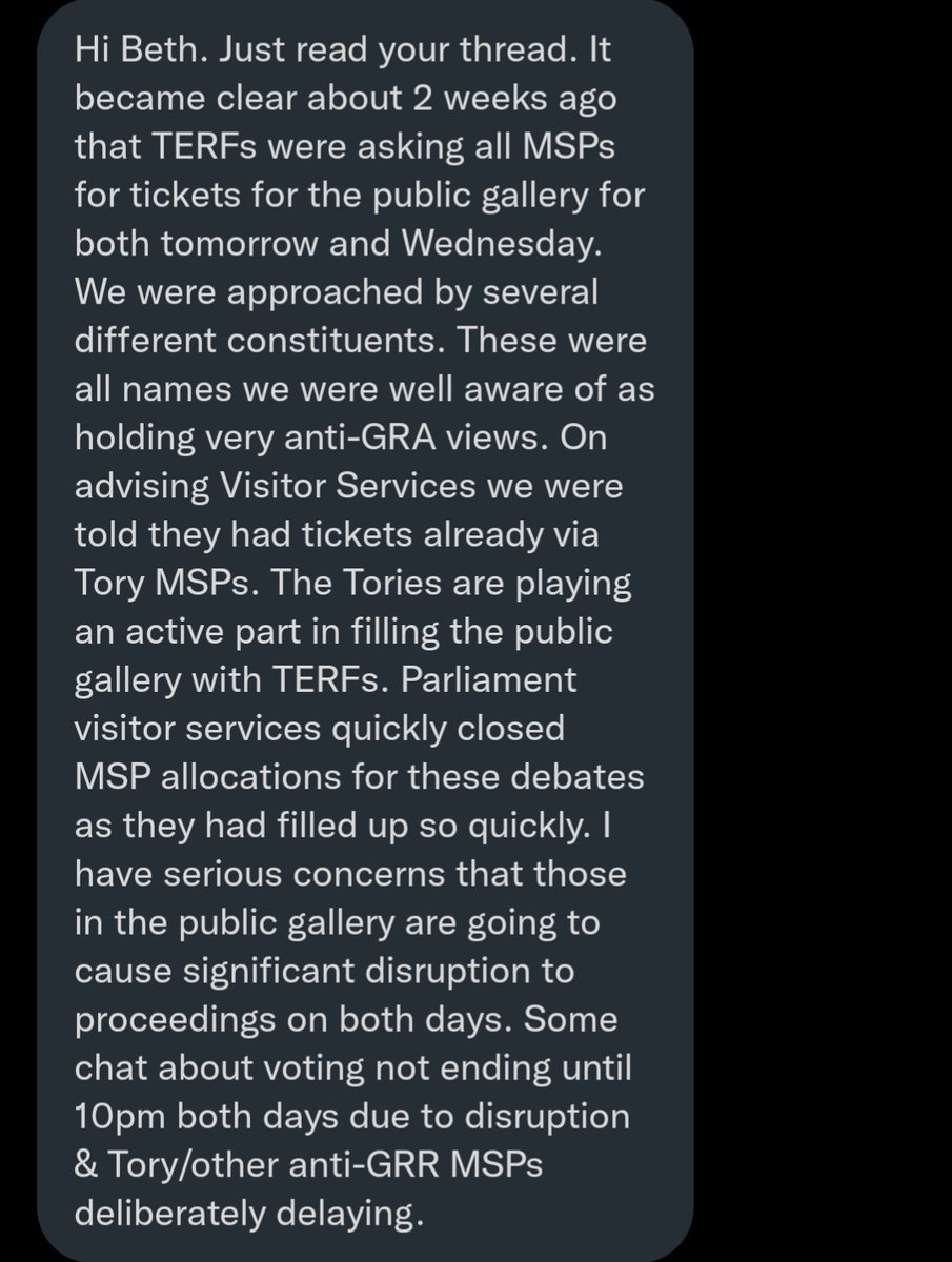 Staff from Parliament have got in touch with me, the Scottish Feminist Network are still exploiting the Scottish Parliaments ticketing system for stage 3. They warn me that they are likely to disrupt the legislative process again & the Tories are helping them do it