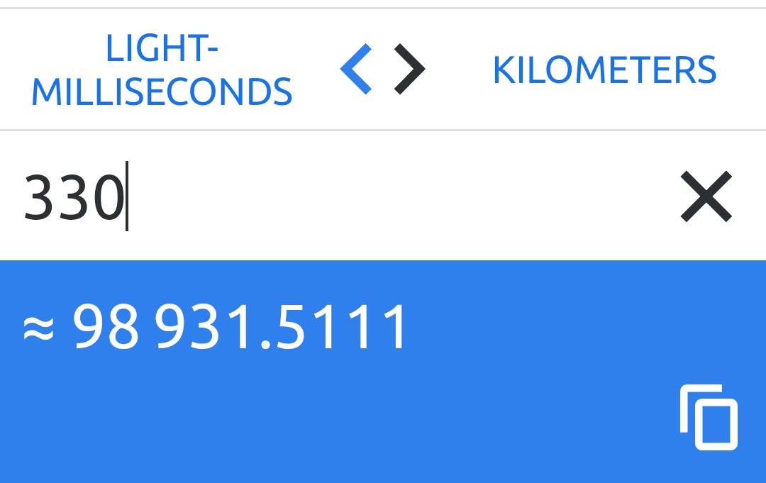 If we know the speed of light we can convert the ping times (in milliseconds) to distances in kilometers or miles, so let's do that