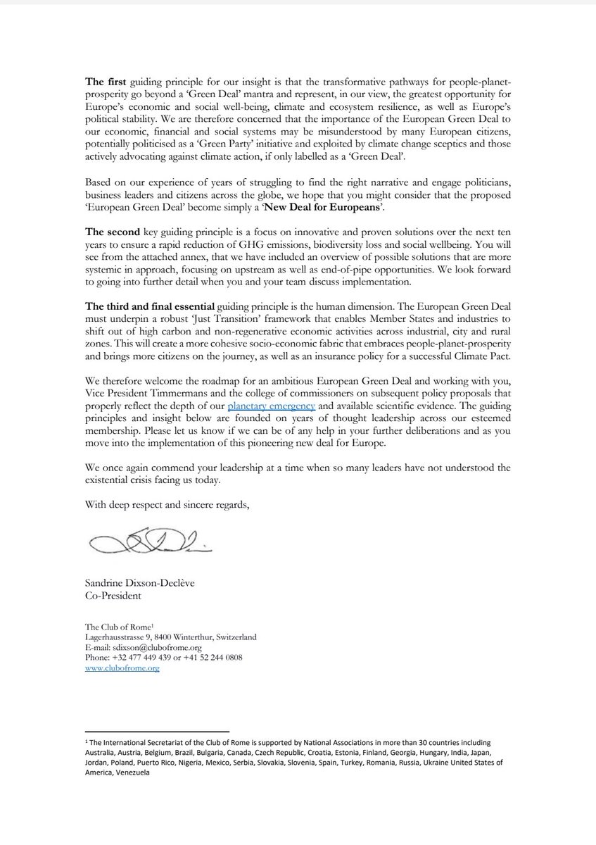 Club of Rome letter to Ursula von der Leyen dated 11th December 2019