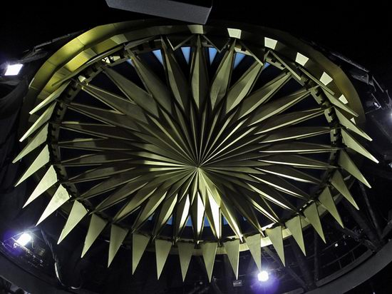 The unsettling structure is divided into 3 sections: an opera house, an enormous meeting room covered in sun worship symbolism, and a strange ritualistic room at the apex.