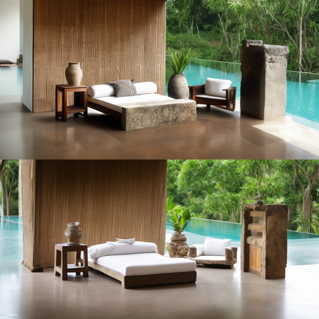 "A beautiful rustic Balinese villa, architecture magazine, modern bedroom, infinity pool outside, design minimalism, stone surfaces"
