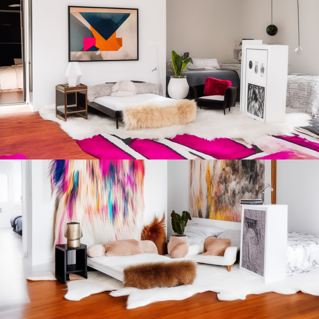6/ "Luxurious modern studio bedroom, trending architecture magazine photo, colorful framed art hanging over bed, design minimalism, furry white rugs, trendy, industrial, pop art, boho chic"