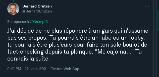Si je vérifie le bullshit qu'il a raconté sur les tests PCR, l'existence de la 2ème vague, les vaccins et le reste, ce serait de fait me mettre du côté des pharmas, des lobbies, etc.