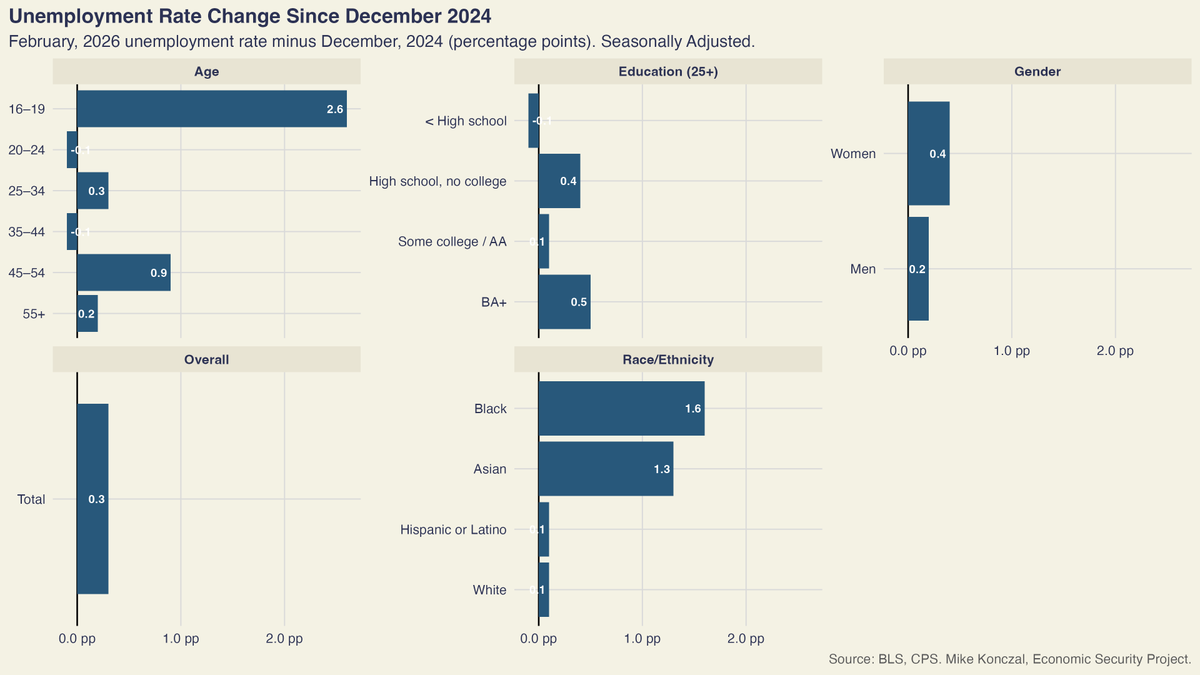 It's up everywhere, but especially for younger workers, black workers, and those with BAs and without a high school diploma, and a bit more for men. This isn't a shift in employment they were hoping for. /2