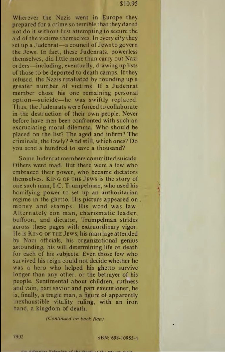 “KING OF THE Jews is the story of one such man, I.C. Trumpelman, who used his horrifying power to set up an authoritarian regime in the ghetto. His picture appeared on. money and stamps. His word was law…”