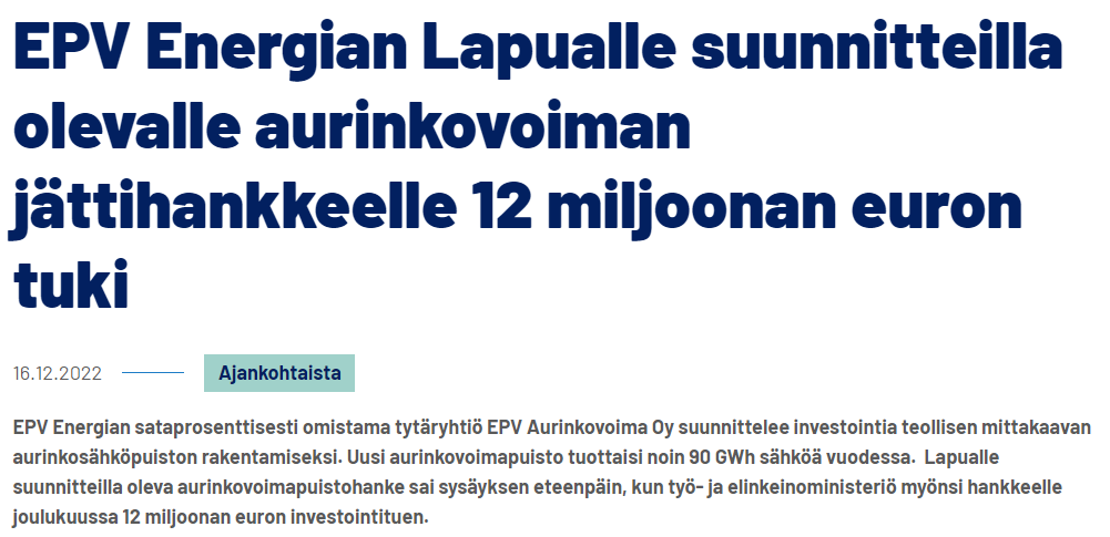 Suomessa aurinkosähkön PPA:n eli pitkäaikaisen (usein 10 v) sähkönostosopimuksen hinta on alle 40 €/MWh (PAP-PPA). Suomen aurinko-PPA markkina voi olla tilastossa kylläkin hyvin ohut, eli lukuun on suhtauduttava varauksella.