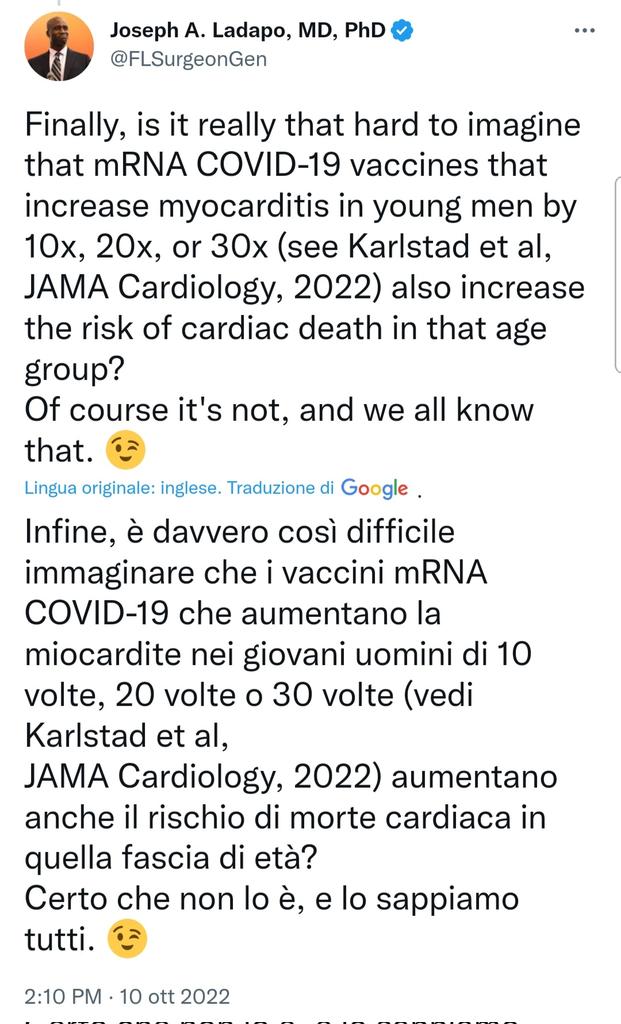 Dr. Joseph Ladapo ha pubblicato una guida per i vaccini mRNA COVID-19, affermando che con "un alto livello di immunità globale a COVID-19, il beneficio della vaccinazione è probabilmente superato da questo rischio...