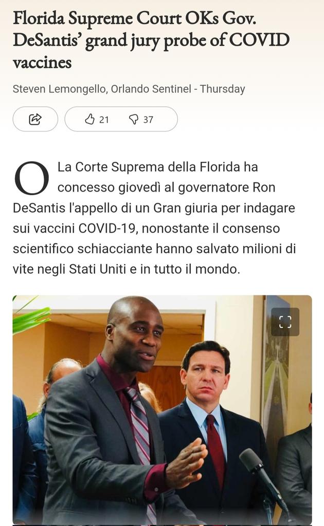 La Corte Suprema della Florida approva l'indagine del grand jury del governatore DeSantis sui vaccini COVID