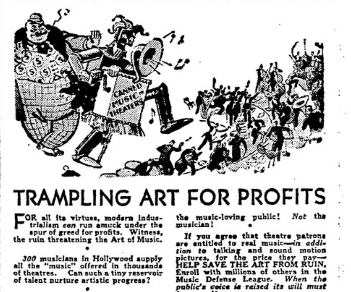 When films were silent, theatres employed local musicians to accompany each screening. But once films gained a soundtrack, local musicians were no longer necessary.
