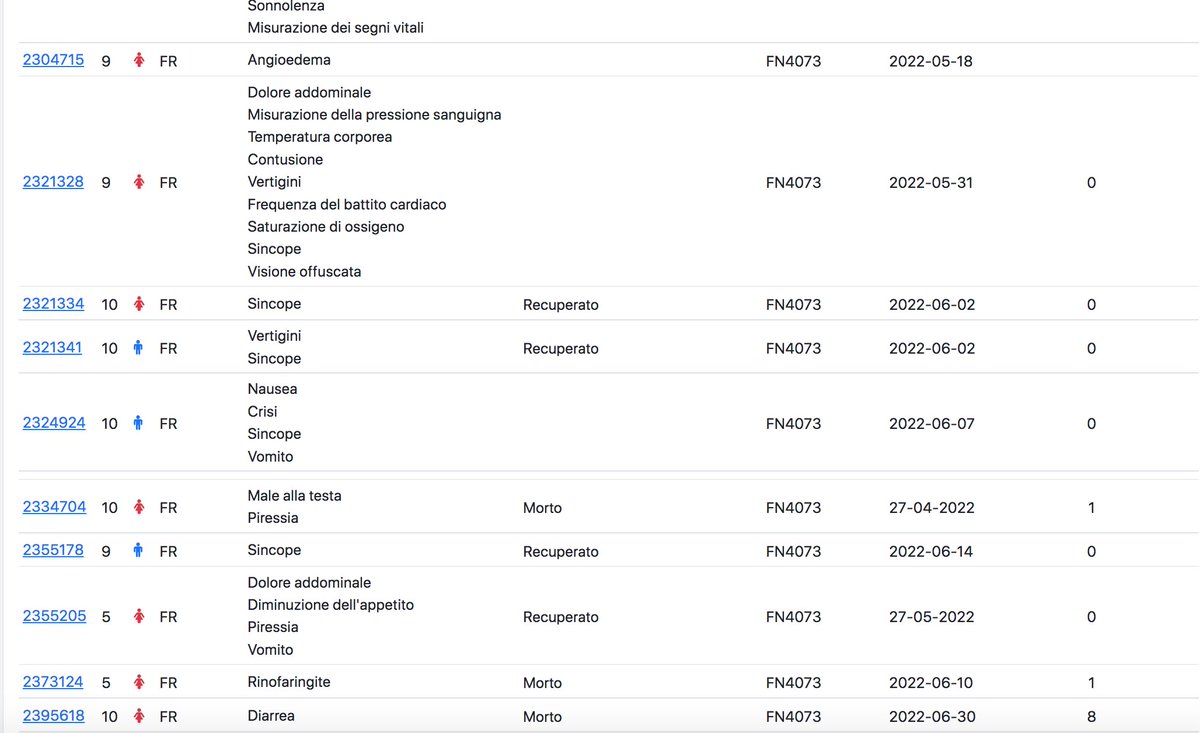"Una paziente di 10 anni ha ricevuto BNT162b2 [Pfizer] (COMIRNATY), il 27 aprile 2022 come dose numero sconosciuto, singola (lotto: FN4073) all'età di 10 anni per via intramuscolare per l'immunizzazione covid-19".
