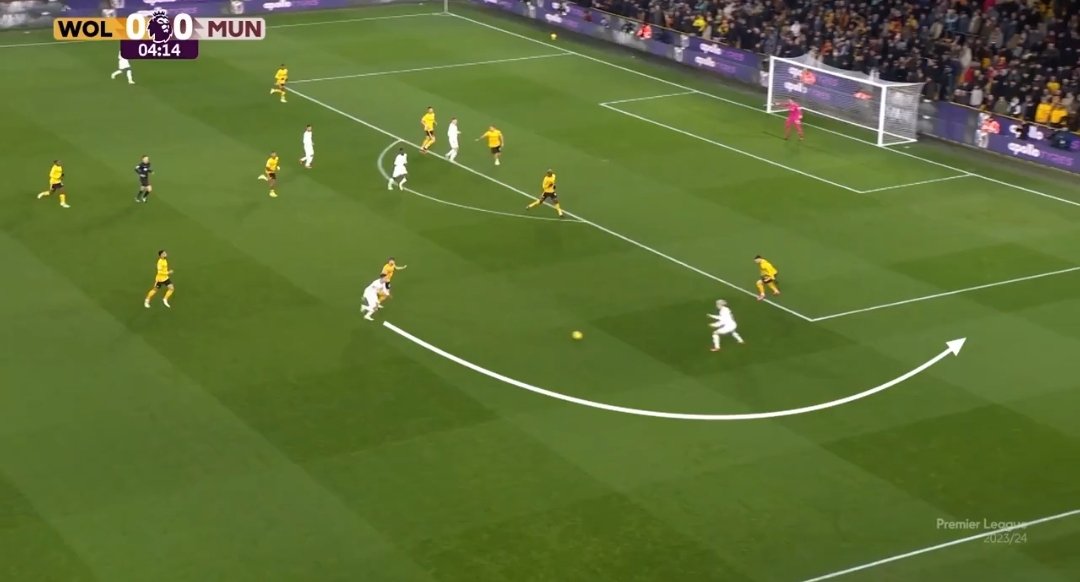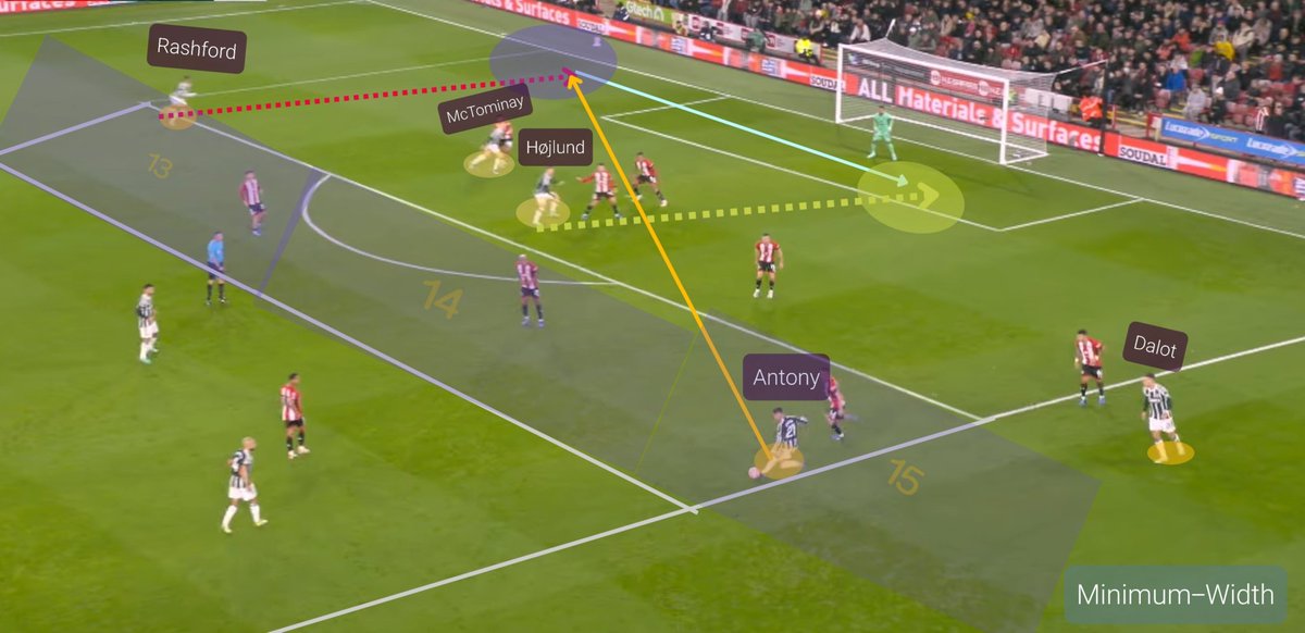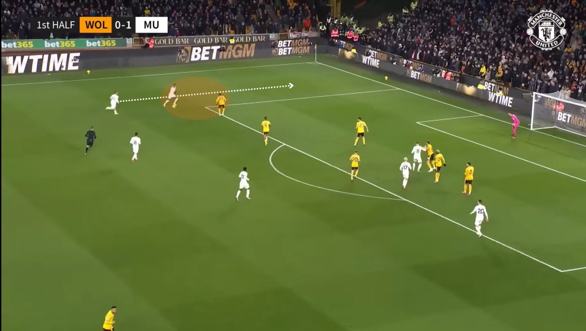 The other mechanism used for progression was playing around the block especially in the left flank using Shaw's creative prowess & Garnacho's 1v1 qualities supported by clever underlapping runs from Malacia and Donny.