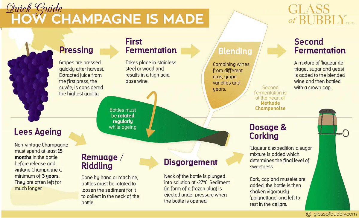 κύτταρα ζύμης (λάσπες) πέσουν στο λαιμό του μπουκαλιού . Ακολουθεί ψύξη και αφαιρείται η οινολάσπη, προστίθεται στη συνέχεια ένα άλλο ένα "μυστικό κοκτέιλ" που έχει σχέση με τον παραγωγό, και στη συνέχεια κλείνονται και είναι έτοιμα 🍾🥂.