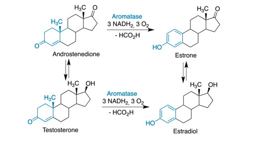 είναι ένζυμο υπεύθυνο για τη βιοσύνθεση των οιστρογόνων στις ωοθήκες και τους μαστικούς αδένες, καθώς μετατρέπει κυρίως τα ανδρογόνα σε οιστρογόνα με αρωματοποίηση( γιατί τι λένε αρωματάση ❓ (ένζυμο που η λειτουργία του είναι η αρωματοποιήση + άση 😉) 2/