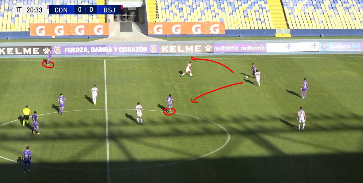 Génesis del gol de San Joaquín, Padilla tiene el balón y tiene dos opciones de pase. Vilches o Alegría.