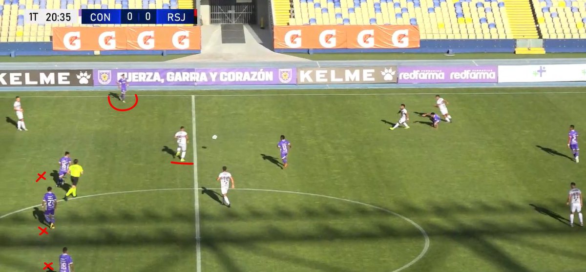 Da el pase al peor sitio posible, pero fijense, con una X están marcados nuestros delanteros. Juntamos en el medio a toda nuestra ofensiva en un intento de querer abrir el espacio a nuestro laterales, lo que traerá consigo una muy mala consecuencia.