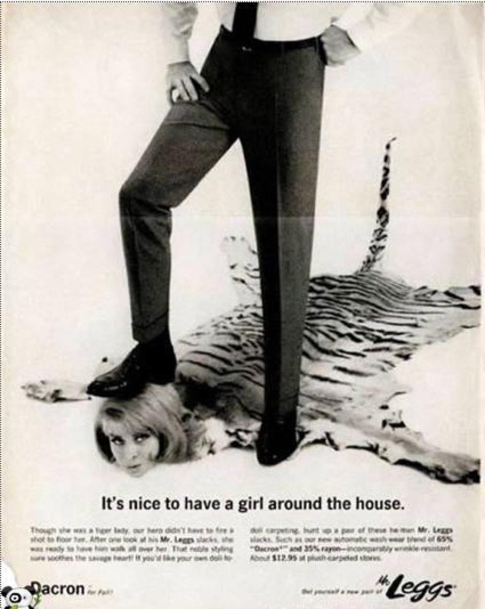 A la derecha, publicidad capitalista en EEUU de un hombre pisando la cabeza de su mujer con la frase: "Es genial tener a una mujer en casa". (1970)
