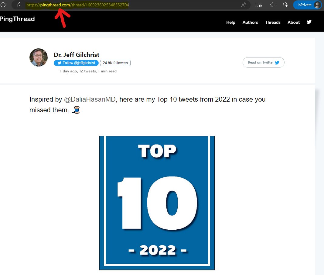 3) Wait for the thread to be processed, and PingThread will then show you the one-page unrolled version. You can now copy the website address (URL) and share that with someone else (see red arrow in image). 7/