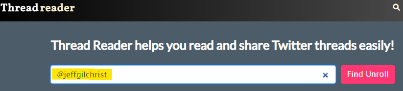 For me that is by typing in the user's Twitter ID instead of a link to one of their tweets like shown in the image, which will bring you here 14/: threadreaderapp.com/user/jeffgilch…