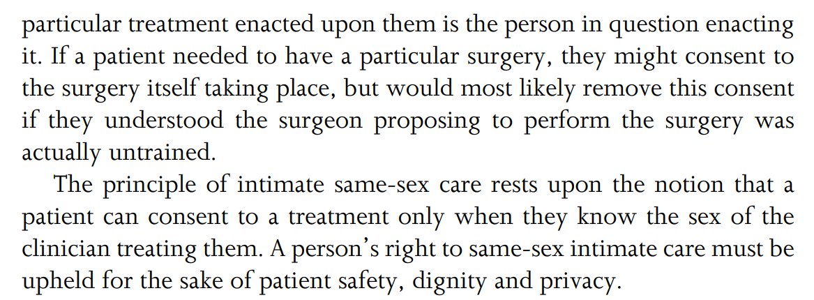 She uses the Health and Social Care Act 2008 to argue that patients can only consent to treatment if they know the biological sex of all those treating or caring for them. I am unfamiliar with this Act, but it seems unlikely to me that it limits consent in any such way.