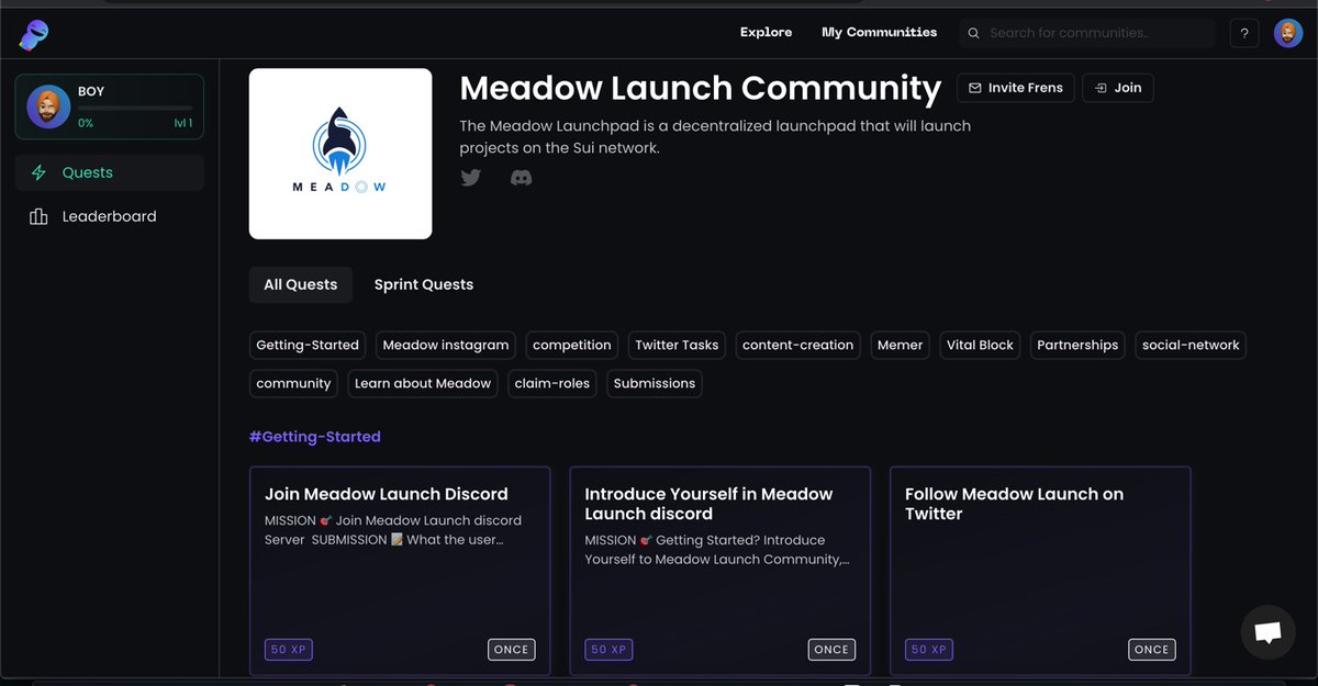 Visit meadowlaunch.crew3.xyz/questboard, perform task and accumulate XP, Try To Complete As Many Quest As Possible & Try To Be Among The Top 200 On The Leaderboard