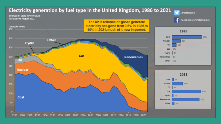Back in 1986, two-thirds of UK electricity generation came from coal, 20% from nuclear, 10% from oil, & 0.6% from gas. Fast forward to 2021 and the clamor for cleaner energy, just 2% of electricity generation came from coal, 40% from gas, 38% from renewables, and 15% from nuclear