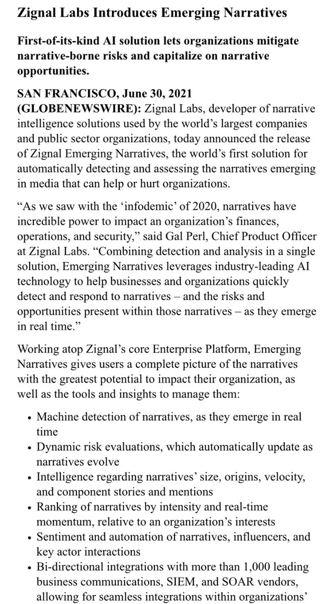 Zignal Emerging Narratives uncovers the top narratives that can impact your organization, even before those narratives have fully emerged. Key narrative insights – like stories, momentum, automation, & influencers – are updated in seconds archive.is/IDhhN