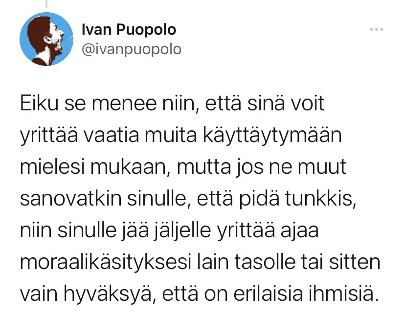 Hyvä esimerkki siitä, kuinka koska moraali on vähän monimutkanen asia ja käsitteellä moraali useita eri merkityksiä, saattaa ihmiset keskustelussa päätyä jopa argumentoimaan itse itseään vastaan.