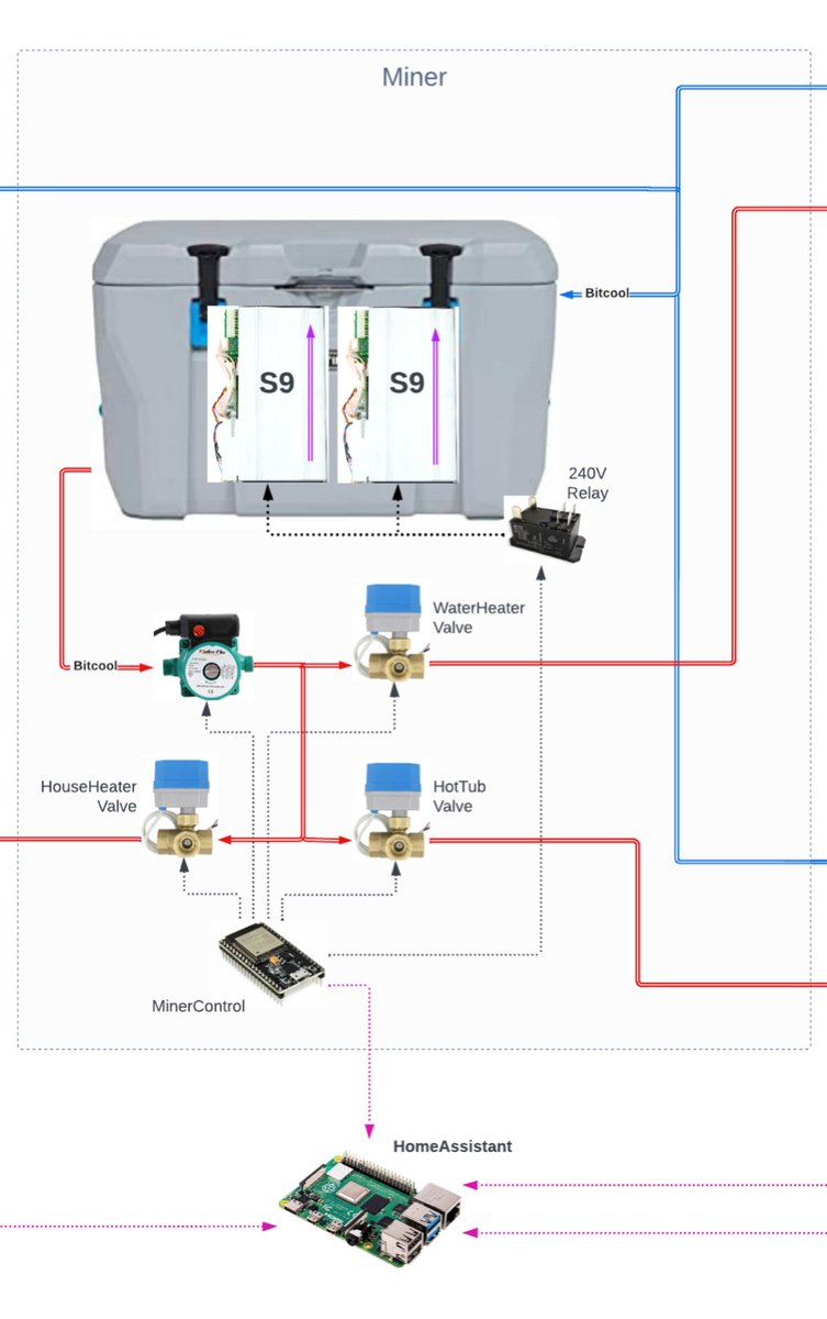 Each consumer has its own oil loop and control system, which tells the central brain (Home Assistant) about temperature and status. The brain turns on the miners and pump and decides which loop receive oil and opens the valves. Each loop can run individually or all together. 4/13