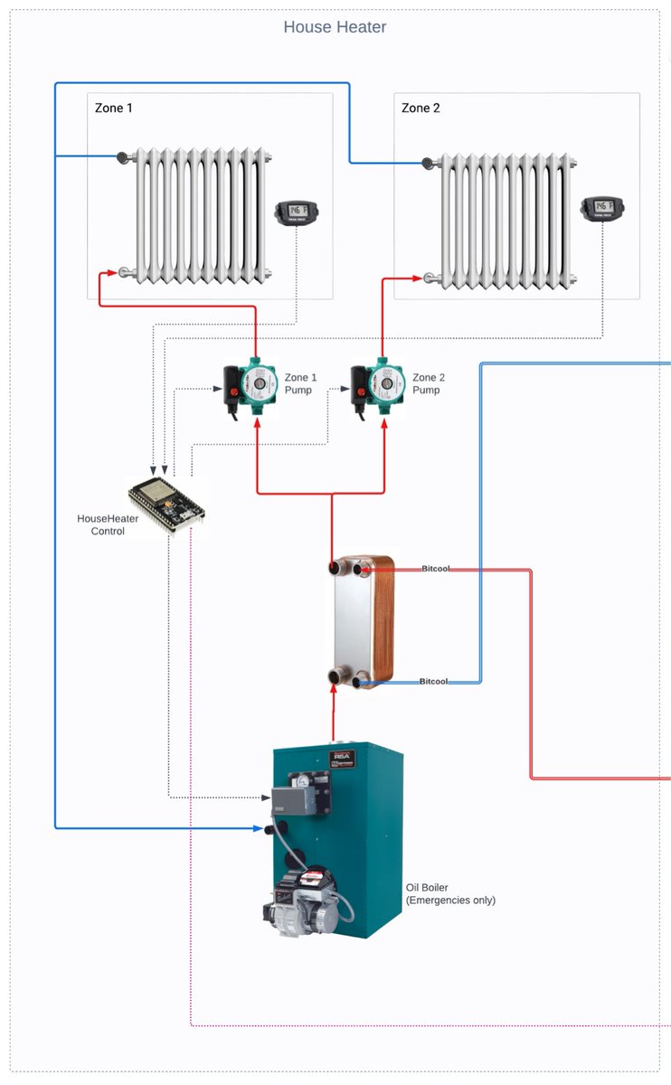 The House is heated through the existing two zone baseboard and radiator heating system, which circulates hot water throughout the house. A plate heat exchanger installed into the existing system transfers the heat from the Bitcool to the water and heats the house. 5/13