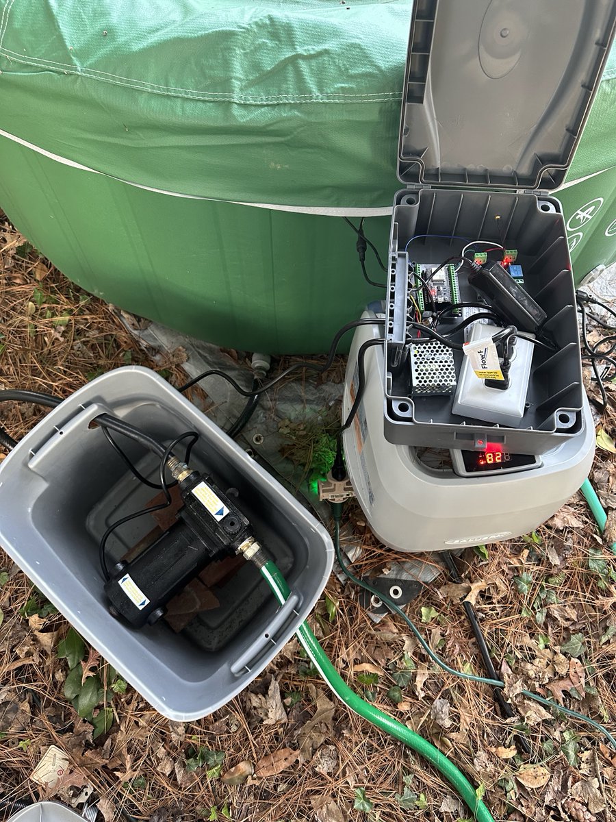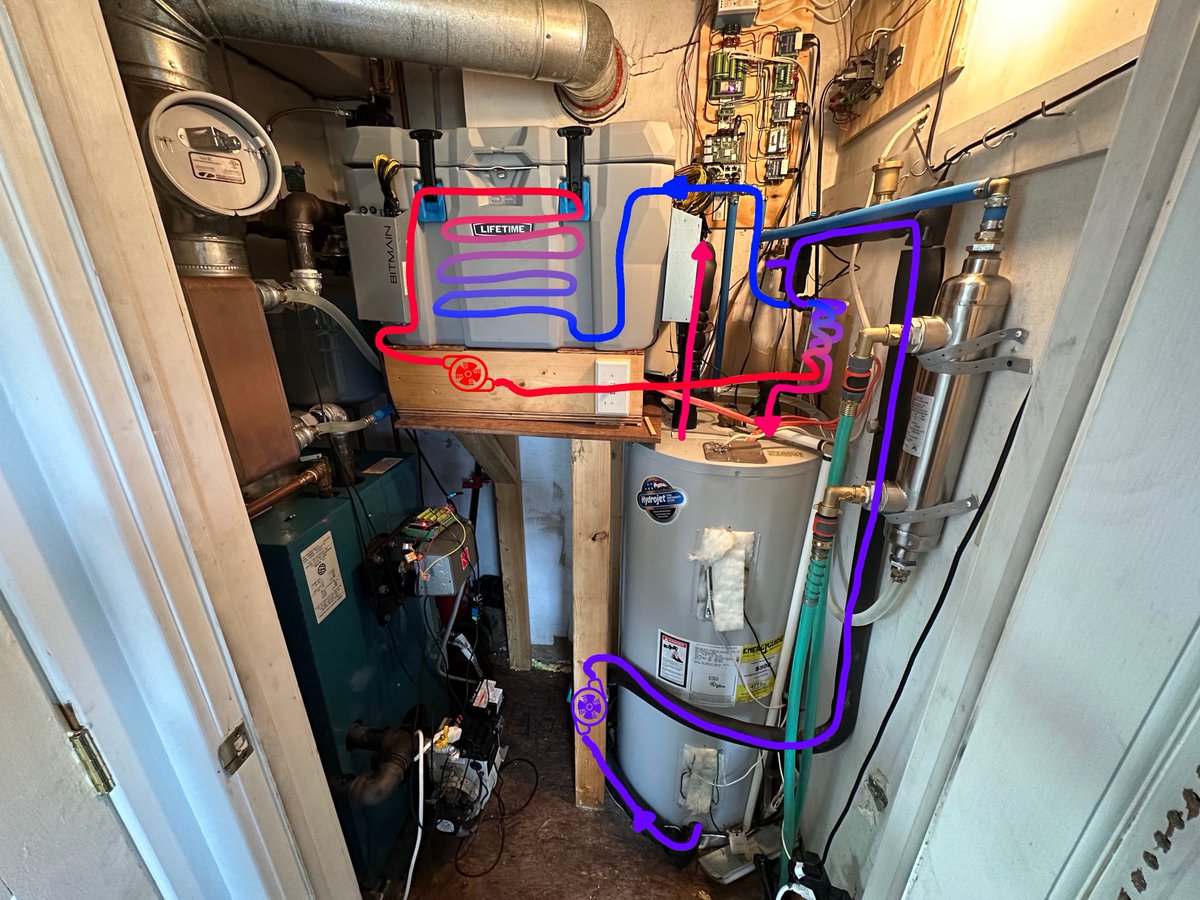 The HotTub is located in the yard, the water is pumped to the house, heated through a heat exchanger and back out to the hot tub. A temperature sensor in the HotTub tells us when it's hot enough to be enjoyed. 7/13
