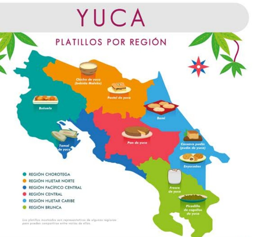 15. La yuca, su preparación es legado indígena al igual que la papa, ayote, pejibaye o maíz. Se preparan pasteles, purés, almidón, y unos enyucados con carne, con una mezcla de leche, harina de trigo y mantequilla que le dan una textura característica.