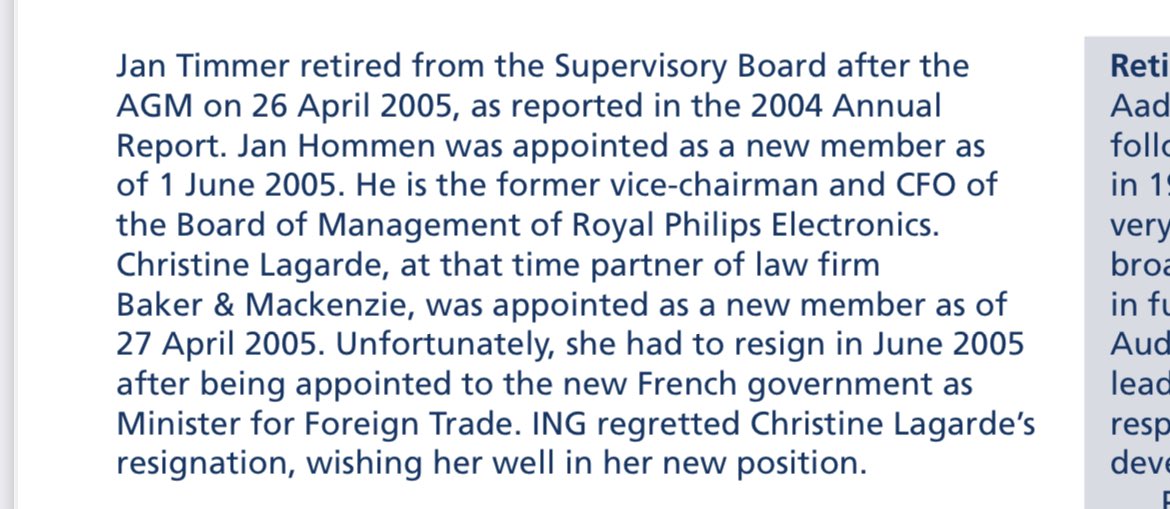 Christine Lagarde blijkt ook een blauwe maandag in 2005 commissaris bij ING Groep te zijn geweest, maar trad binnen paar maanden af vanwege haar nieuwe functie als onderminister in Frankrijk.