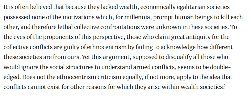 "It is often believed that because they lacked wealth, economically egalitarian societies possessed none of the motivations which, for millennia, prompt human beings to kill each other, and therefore lethal collective confrontations were unknown in these societies."