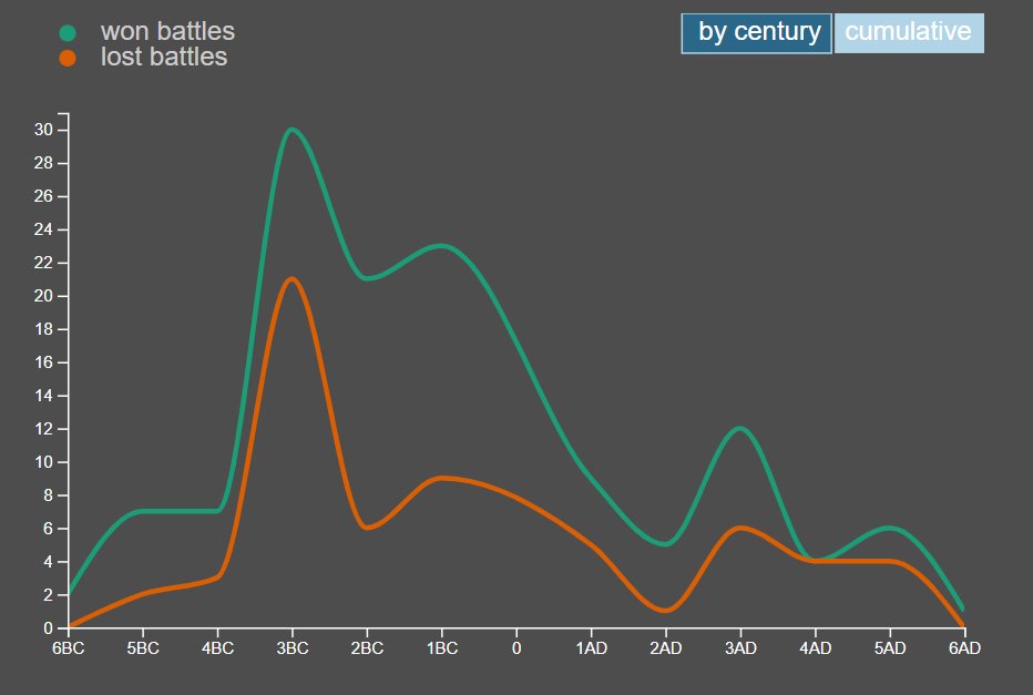 Lots of battles early on, than age of expansion and domination until maximum extant under Trajan, things pick up again in the crisis of the third century. Decline in the 4th as the western empire collapse.