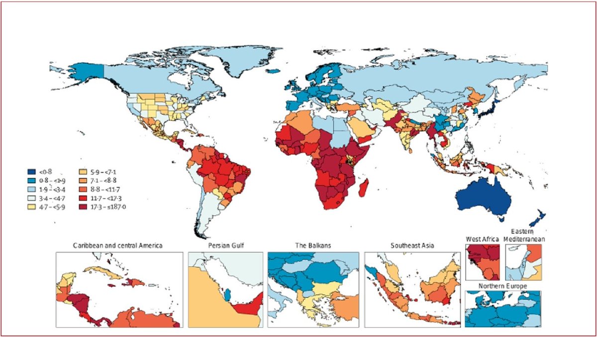 This is a map of G6PDD deficiency,perhaps the most common enzyme deficiency in the world. Despite killing around 33k people yearly it has spread to 400 million people because it provides protection against malaria.