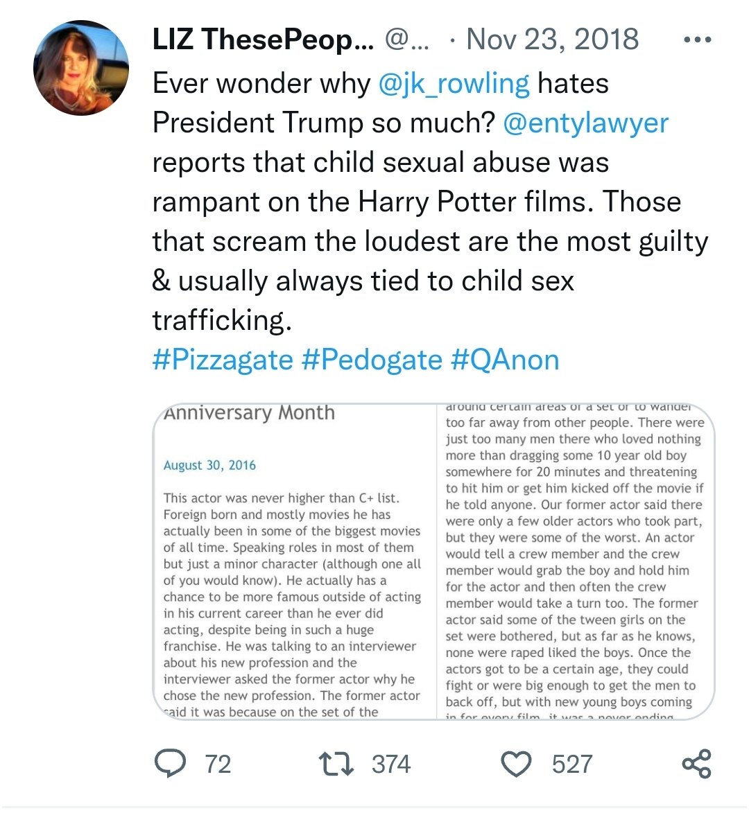 In addition to Mike Flynn and David Icke getting reanimated, everyone's favorite gossip columnist turned pedo spotter Liz Crokin is now back on Twitter. And she's got videos to peddle.