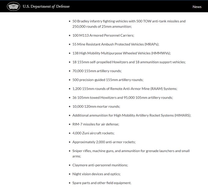 #Ukraine: 5. List of US additional aid to UA in the latest $3.075 package includes 100 armoured personnel carriers and ammo for HIMARS: #tweet100 (Pic: @GlasnostGone)