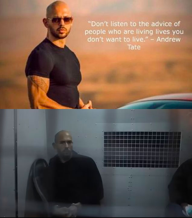 Now it's Tate's "Choke women, fathers shouldn't stick around, what colour is your Bugatti?"