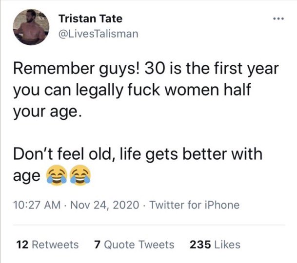 Interestingly on the 24 Nov 2020, Tristan Tate tweeted about having sex with 15 year olds, from his suspended account verified as belonging to Tristan.