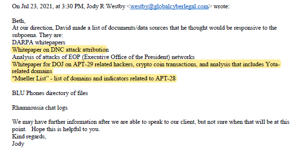 I snagged these from the Georgia Attorney General who was helping coordinate responses to subpoenas. Together, they showed involvement in the DNC hack attribution: